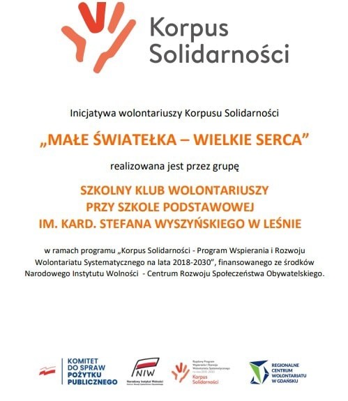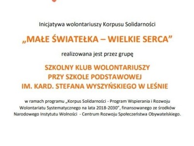 Od 23 października Szkolny Klub Wolontariusza rozpoczął realizację projektu „Małe światełka – wielkie serca” w ramach programu „Korpus Solidarności - Program Wspierania i Rozwoju Wolontariatu Systematycznego na lata 2018-2030”, finansowanego ze środków Narodowego Instytutu Wolności – Centrum Rozwoju Społeczeństwa Obywatelskiego. Dzięki przyznanemu grantowi w wysokości 1000 zł, wolontariusze mieli okazję organizować różnorodne działania, które angażowały społeczność szkolną i promowały ideę wolontariatu.