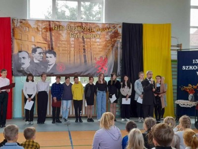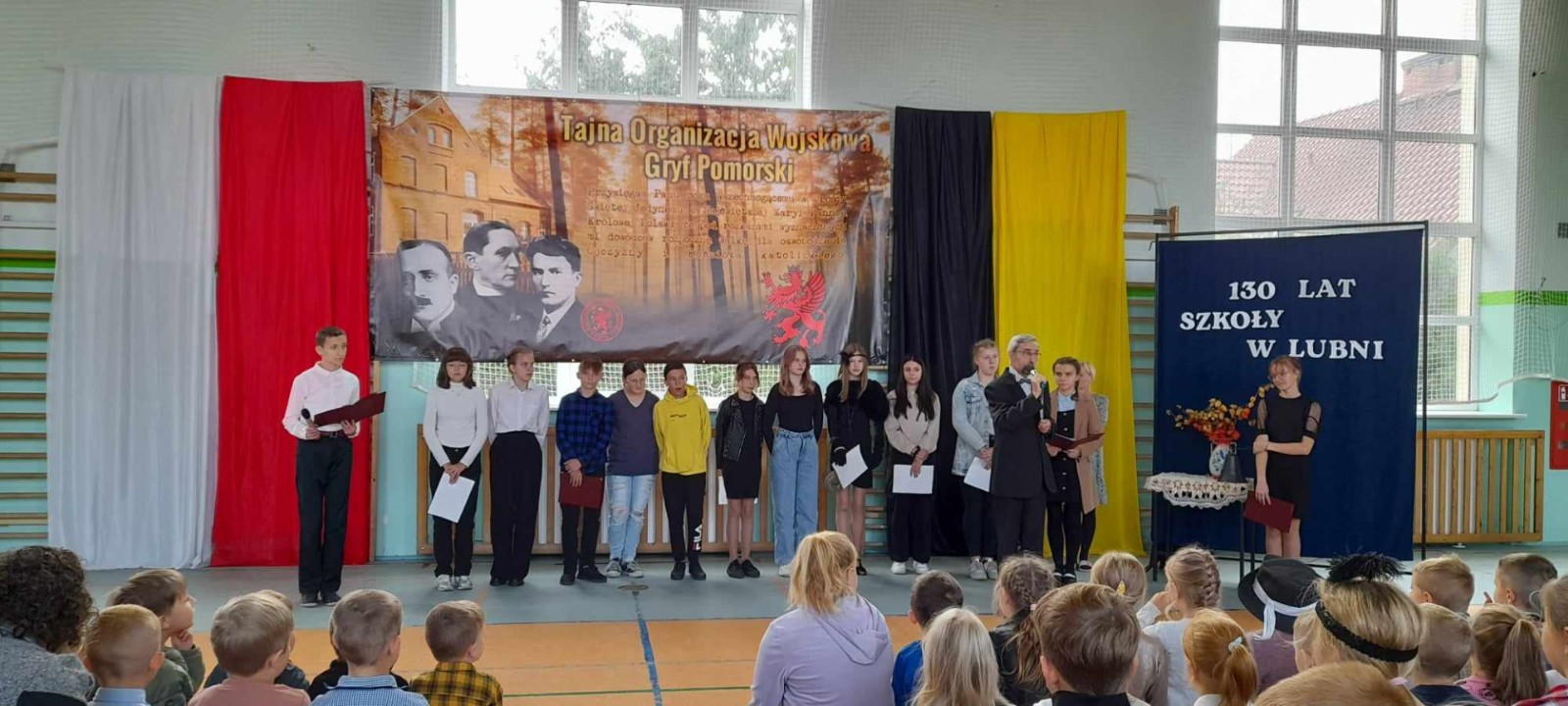 Tegoroczne Święto Szkoły obchodziliśmy przebrani w stroje z przełomu XIX i XX w. Podczas uroczystej akademii 9 października 2023 r., w asyście pocztu sztandarowego Szkoły Podstawowej im. Tajnej Organizacji Wojskowej „Gryf Pomorski” w Lubni, uczniowie klasy siódmej przypomnieli najważniejsze wydarzenia z historii szkoły. Ważnym punktem montażu słowno – muzycznego było upamiętnienie naszego Patrona – TOW „Gryf Pomorski”.