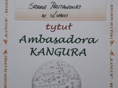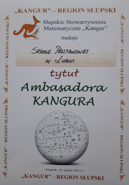 W tegorocznej edycji Międzynarodowego Konkursu Matematycznego KANGUR 2021 udział wzięło około 4100 uczniów ze 154 szkół podstawowych i szkół średnich. Wśród nagrodzonych znaleźli się uczniowie SP im TOW "Gryf Pomorski" w Lubni. Tytuł Laureata Międzynarodowego Konkursu “Kangur Matematyczny” otrzymał Szymon Warsiński z klasy czwartej, natomiast wyróżnieniami mogą się pochwalić Anna Peplińska z klasy ósmej oraz Igor Kłodziński z klasy siódmej b.