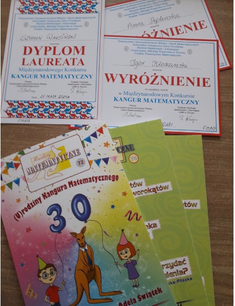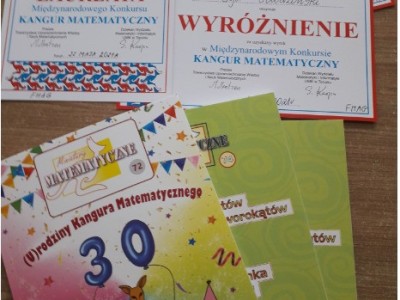 Pragniemy również poinformować, iż nasza szkoła otrzymała w tym roku tytuł „Ambasadora Kangura”. Wyróżnienie zostało przyznane kilkunastu szkołom przez Regionalny Komitet Organizacyjny z okazji 30-lecia Konkursu “Kangur Matematyczny” za wieloletnie uczestnictwo, osiągnięte wyniki oraz promowanie konkursu. Z tej okazji otrzymaliśmy dyplom oraz grafikę dr. Pawła Jarka, będącego inicjatorem i organizatorem konkursu “Kangur Matematyczny” w Polsce.