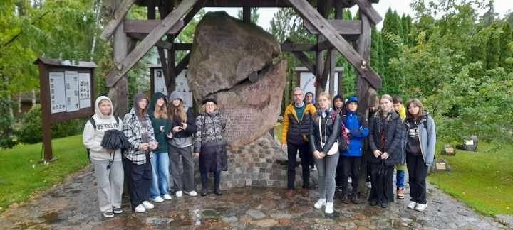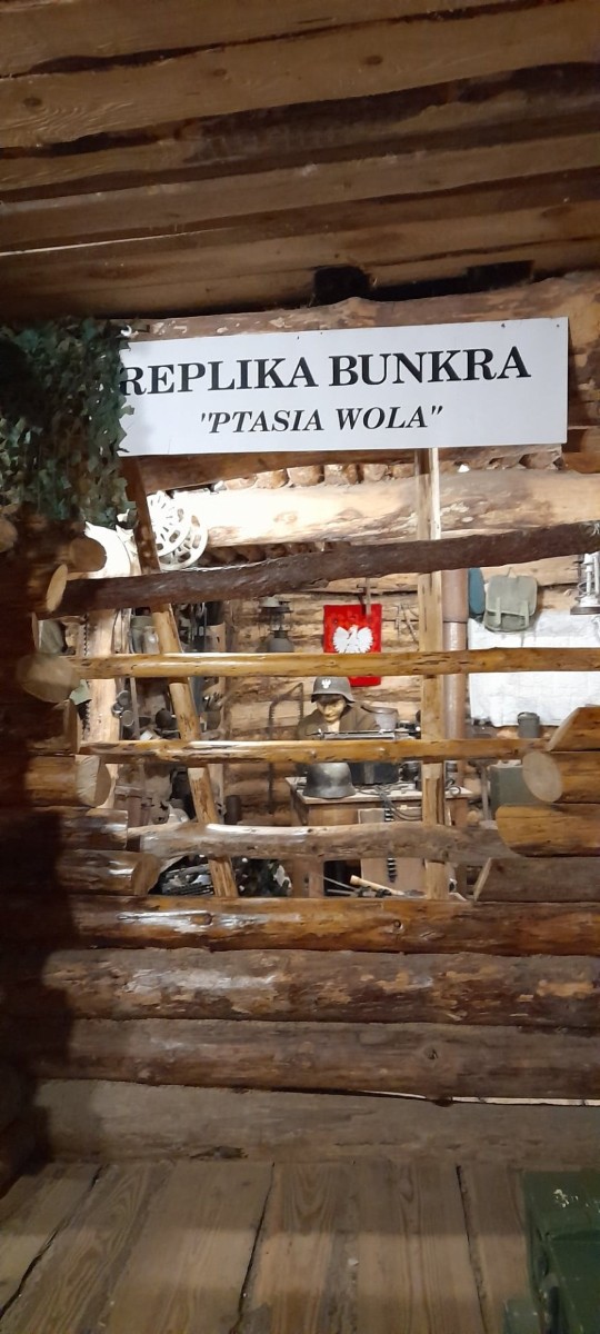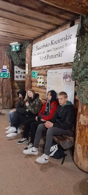 Zawitaliśmy także do Centrum Edukacji i Promocji Regionu w Szymbarku, gdzie wraz z przewodnikiem odkrywaliśmy unikatowe rekordy rodem z Kaszub, lecz również bolesne i jakże trudne losy ludności kaszubskiej podczas historycznych zawirowań. Tutaj również natknęliśmy się na ślady naszego Patrona. Zwiedziliśmy replikę bunkra „Ptasia Wola”. To rekonstrukcja partyzanckiego schronu TOW „Gryf Pomorski” z czasów drugiej wojny światowej. Również w Szymbarku poruszył nas obelisk z wymownym napisem „Wierni pamięci tych za których życie żyć możemy”. Pomnik o kształcie serca wyrytego w ogromnym kamieniu; serca, które musi być twarde jak głaz, by przetrwać, by pozwolić żyć innym. Żołnierze Tajnej Organizacji Wojskowej „Gryf Pomorski” takie właśnie serca mieć musieli. Pocisk wbity w serce i pęknięty krzyż, to nie symbol utraty wiary. Jeśli nawet wszystko sprzysięgło się przeciw, to żołnierze „Gryfa” starali się ocalić swoją wiarę w Boga , Honor, Ojczyznę.