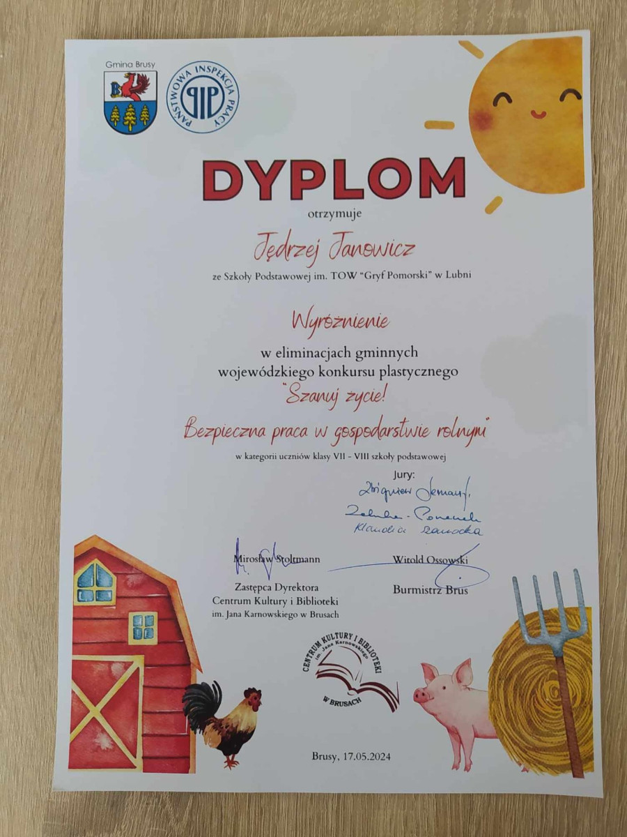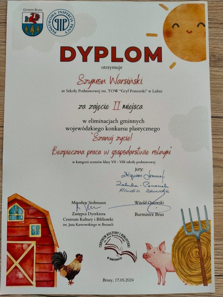 Dnia 17 maja 2024r. w Centrum Kultury i Biblioteki im. Jana Karnowskiego w Brusach wręczono nagrody w gminnym etapie wojewódzkiego konkursu plastycznego „Szanuj życie! Bezpieczna praca w gospodarstwie rolnym”. Organizatorem wojewódzkiego konkursu jest Okręgowy Inspektorat Pracy w Gdańsku, który od wielu lat upowszechnia wśród dzieci i młodzieży szkół wiejskich działania profilaktyczne dotyczące zagrożeń wypadkowych i zdrowotnych występujących w gospodarstwach rolnych.