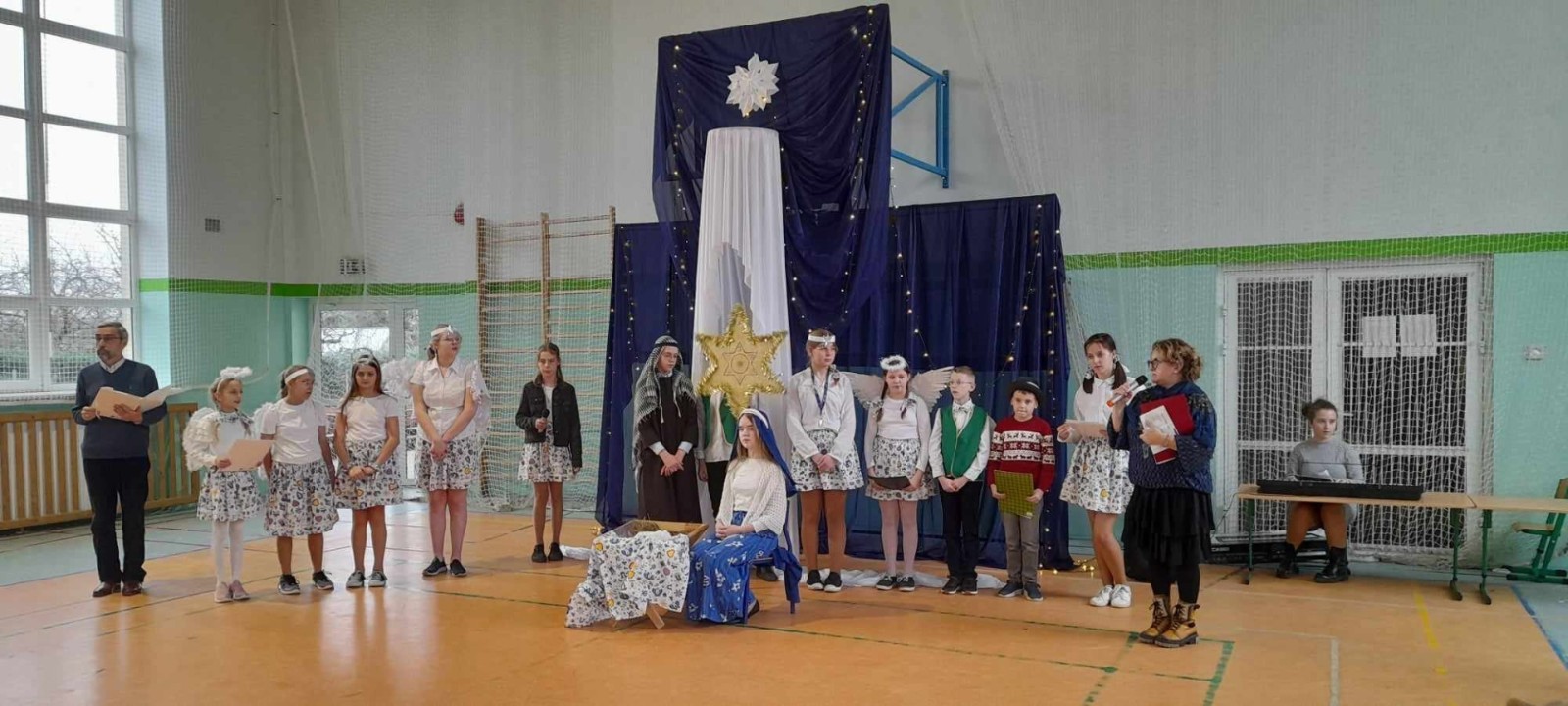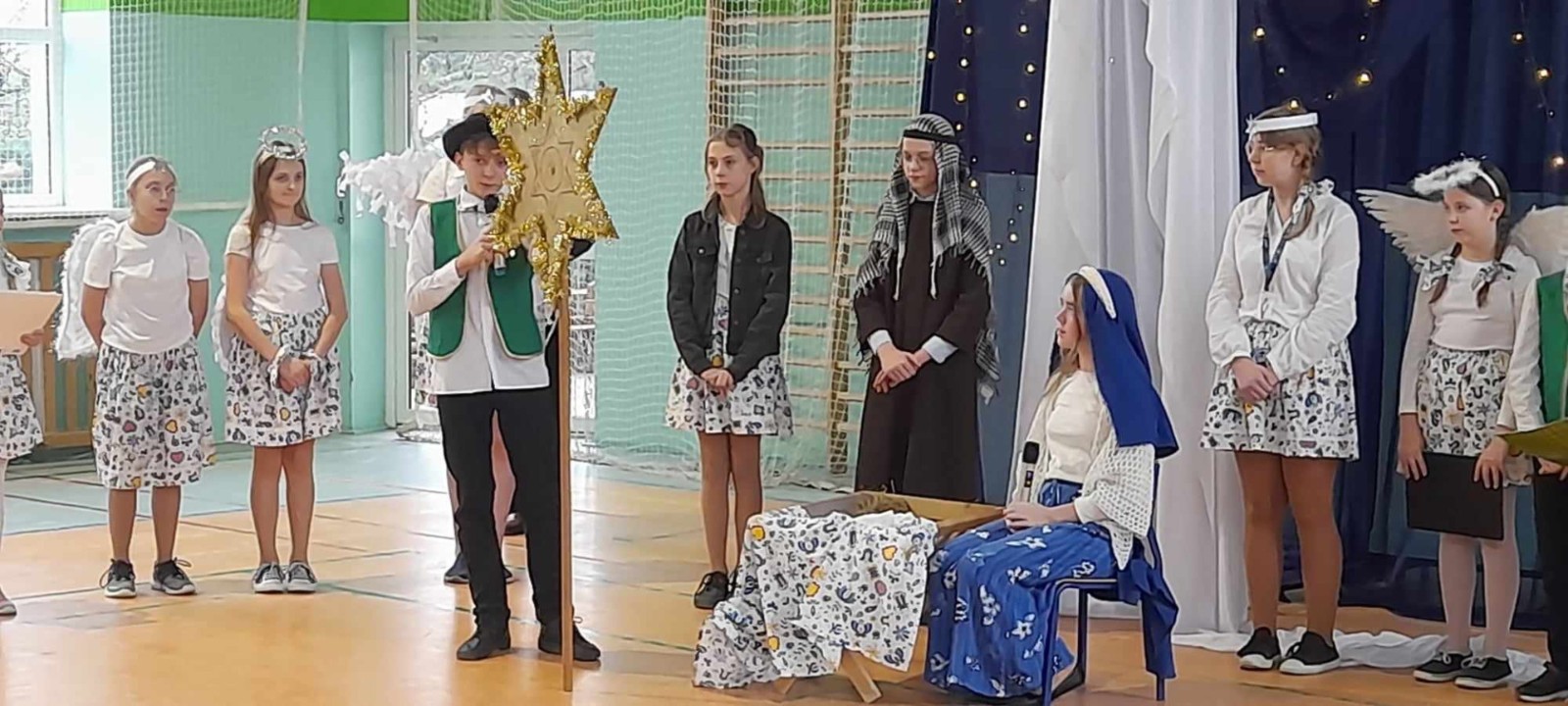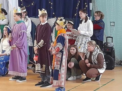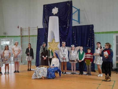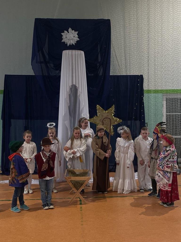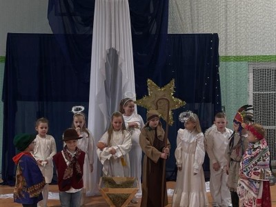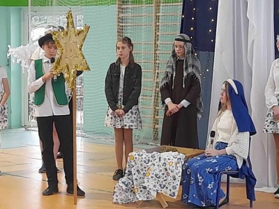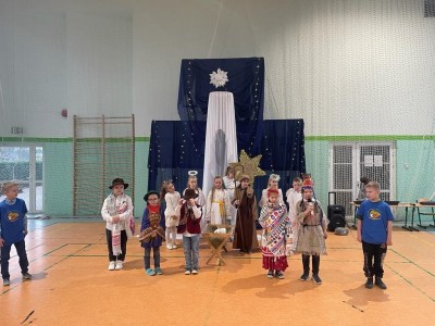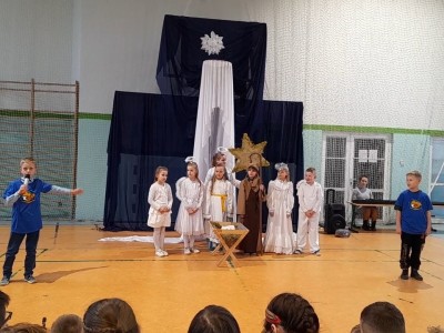Najmłodsi uczniowie pod kierunkiem p. Teresy Kin zaprezentowali misyjne jasełka, zaś uczniowie klas starszych, przedstawili jasełka kaszubskie pt. „Czej sã Christus rodzy”, w reżyserii p. Justyny Górskiej i p. Tomasza Klamana. Dekorację przygotowała p. Monika Trawicka.