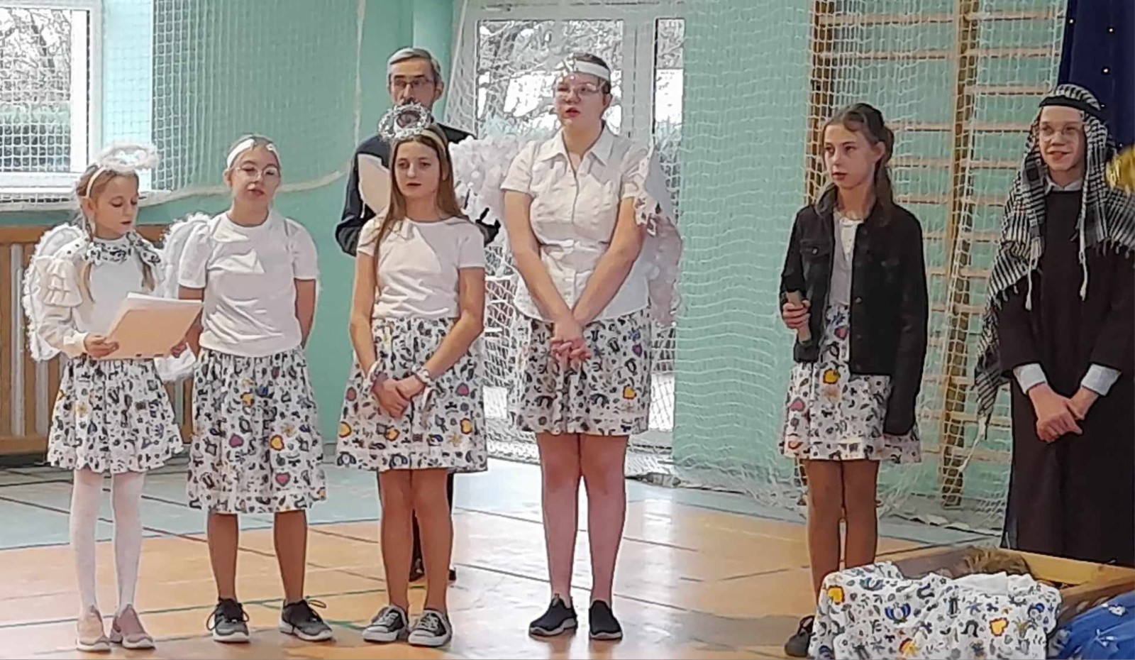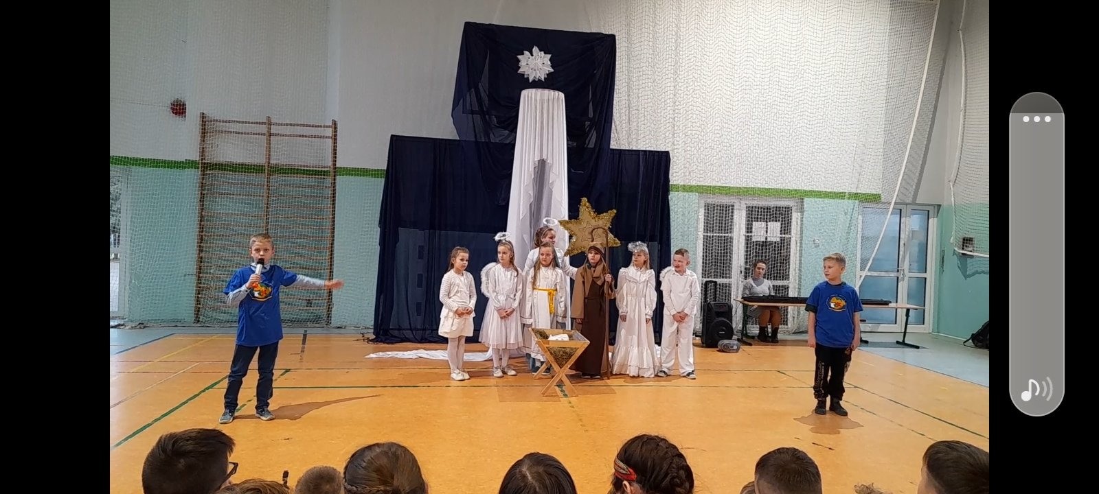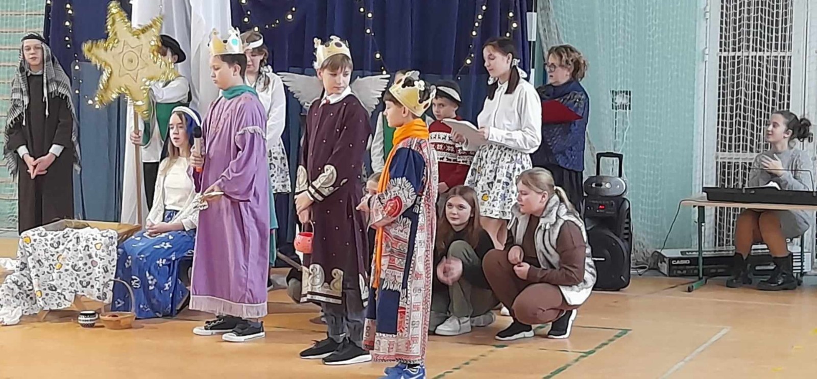 Najmłodsi uczniowie pod kierunkiem p. Teresy Kin zaprezentowali misyjne jasełka, zaś uczniowie klas starszych, przedstawili jasełka kaszubskie pt. „Czej sã Christus rodzy”, w reżyserii p. Justyny Górskiej i p. Tomasza Klamana. Dekorację przygotowała p. Monika Trawicka.