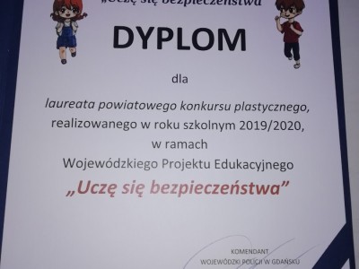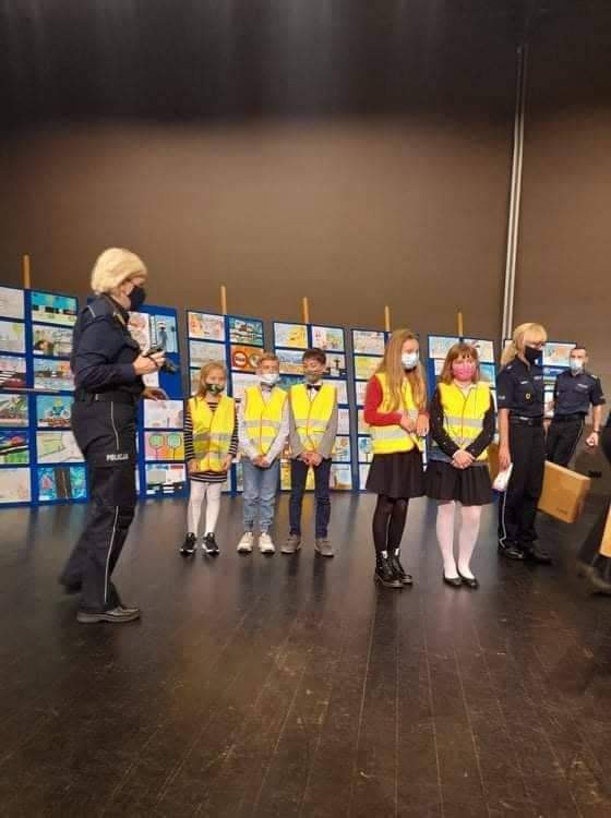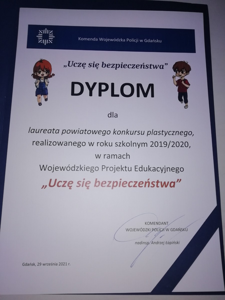 Uczniowie Szkoły Podstawowej w Męcikale zostali laureatami powiatowego konkursu plastycznego realizowanego w ramach Wojewódzkiego Projektu Edukacyjnego „Uczę się bezpieczeństwa” przez Komendę Główną Policji w Gdańsku. Troje naszych uczniów Ewelina Hamerska, Maciej Myszka, Kacper Kłopotek 29 września 2021 r. wzięło udział w uroczystej gali podsumowującej projekt, która odbyła się na Uniwersytecie Gdańskim. Uczniowie pod opieką rodziców i przedstawicieli chojnickiej policji otrzymali pamiątkowe dyplomy oraz nagrody. Serdecznie gratulujemy dzieciom talentu plastycznego.