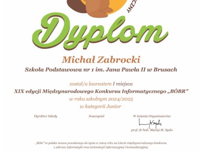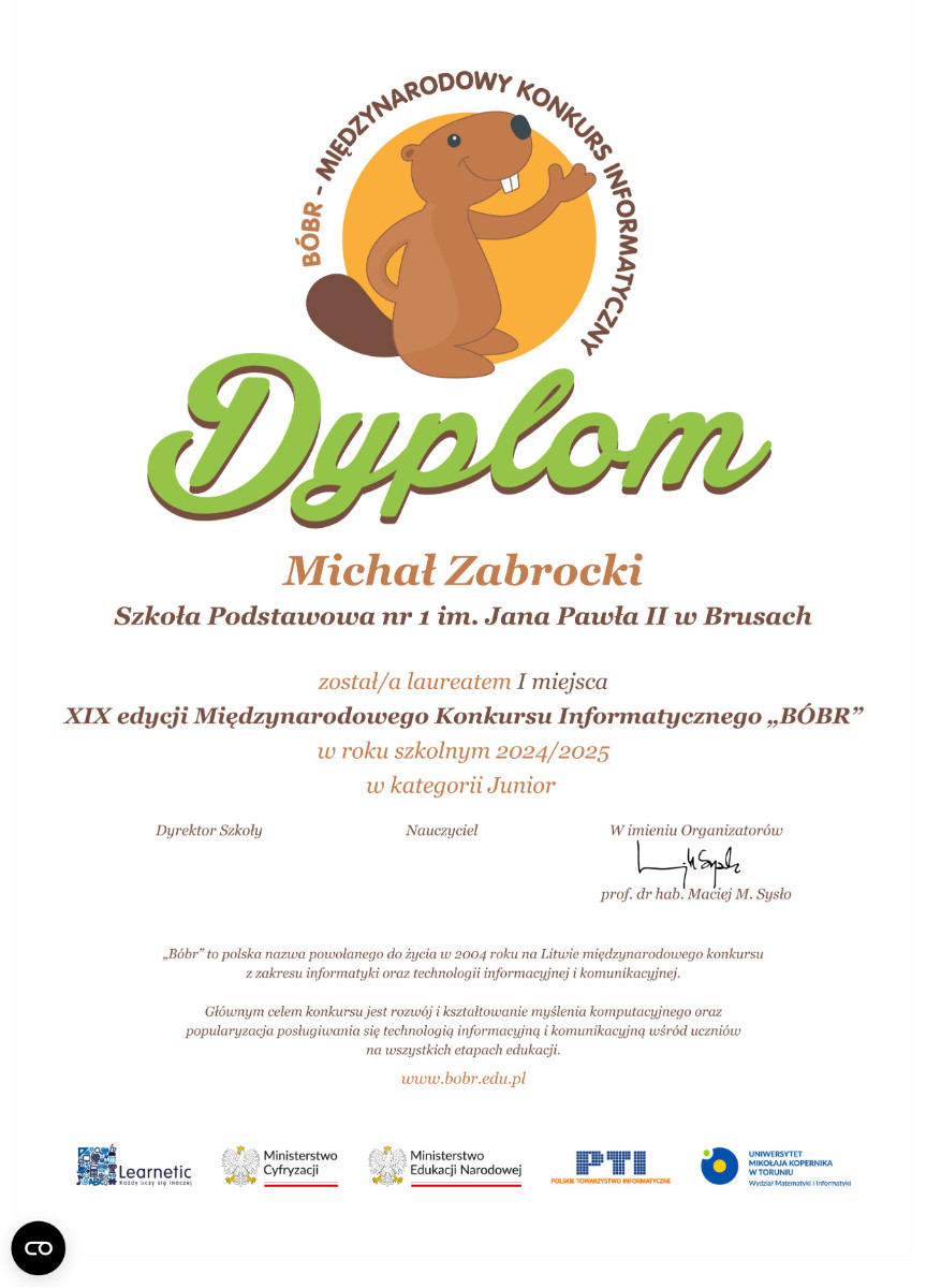 W dniu 14 marca 2025 roku (piątek) o godzinie 11.00 w Auli Wydziału Matematyki i Informatyki UMK w Toruniu odbyło się uroczyste zakończenie polskiej XIX edycji międzynarodowego Konkursu Informatycznego „Bóbr”. Podczas uroczystości zarejestrowany laureat I miejsca z kl. VIIb Michał Zabrocki otrzymał dyplom i nagrody rzeczowe.