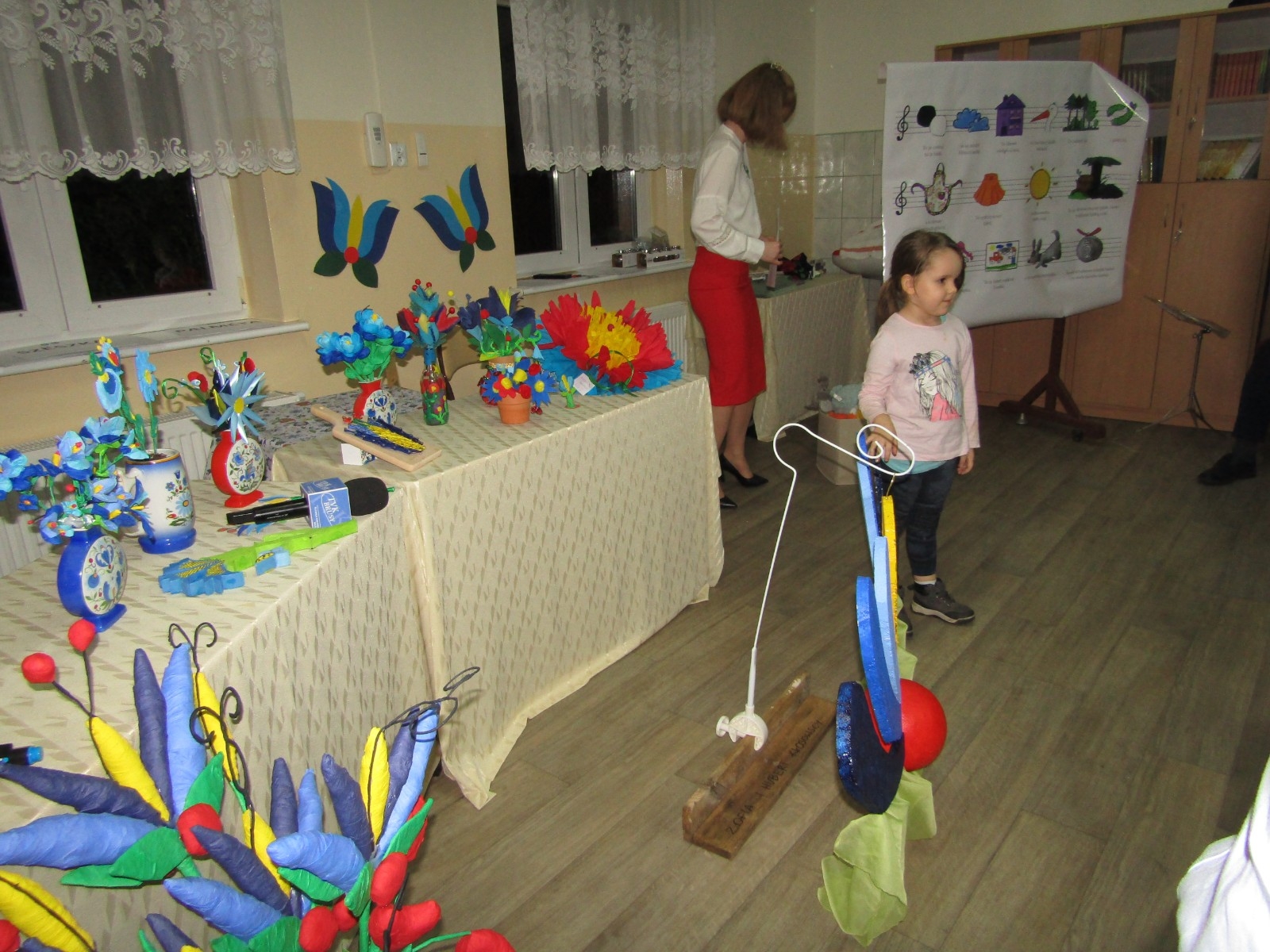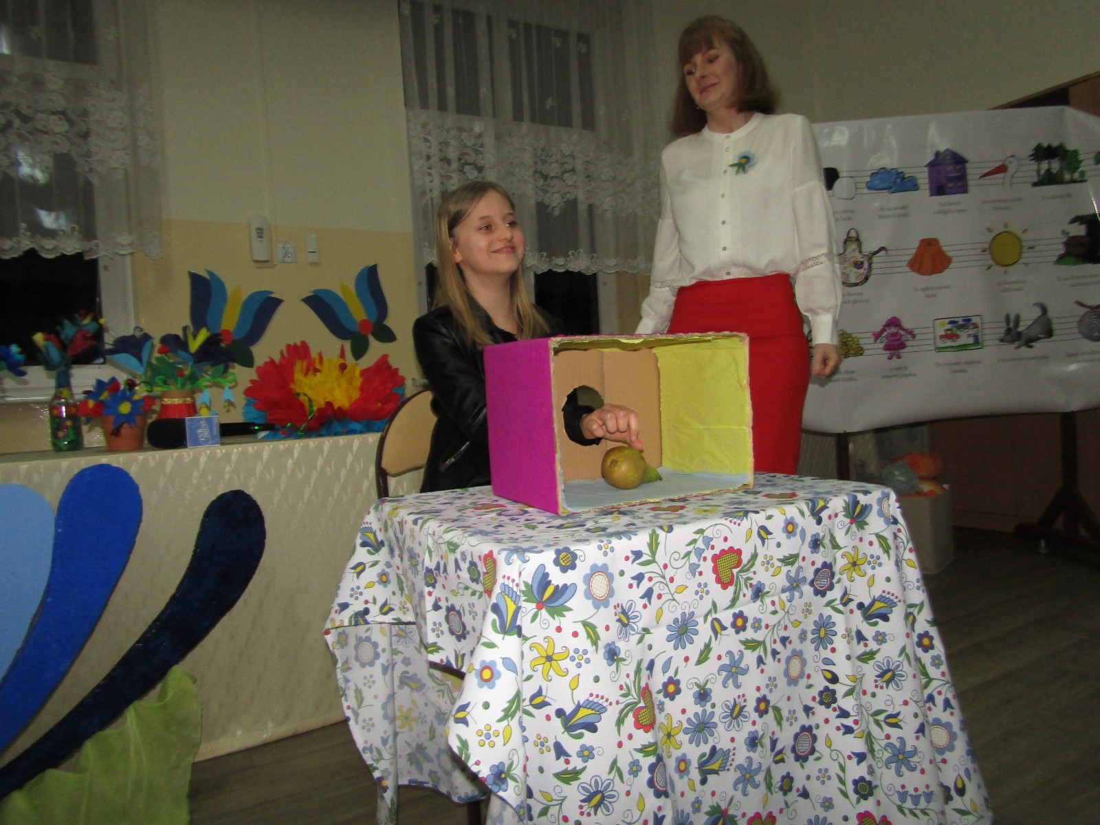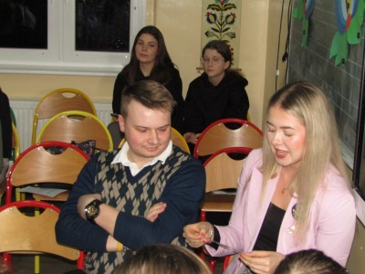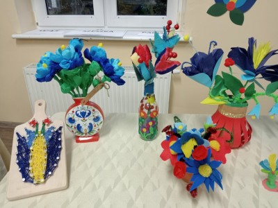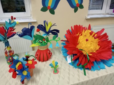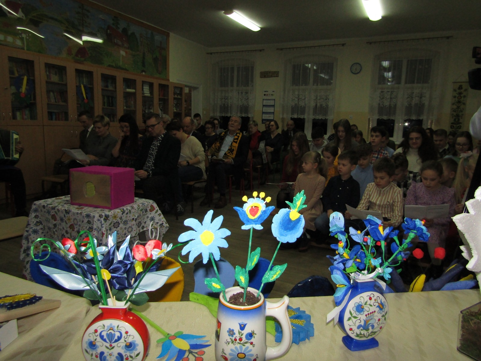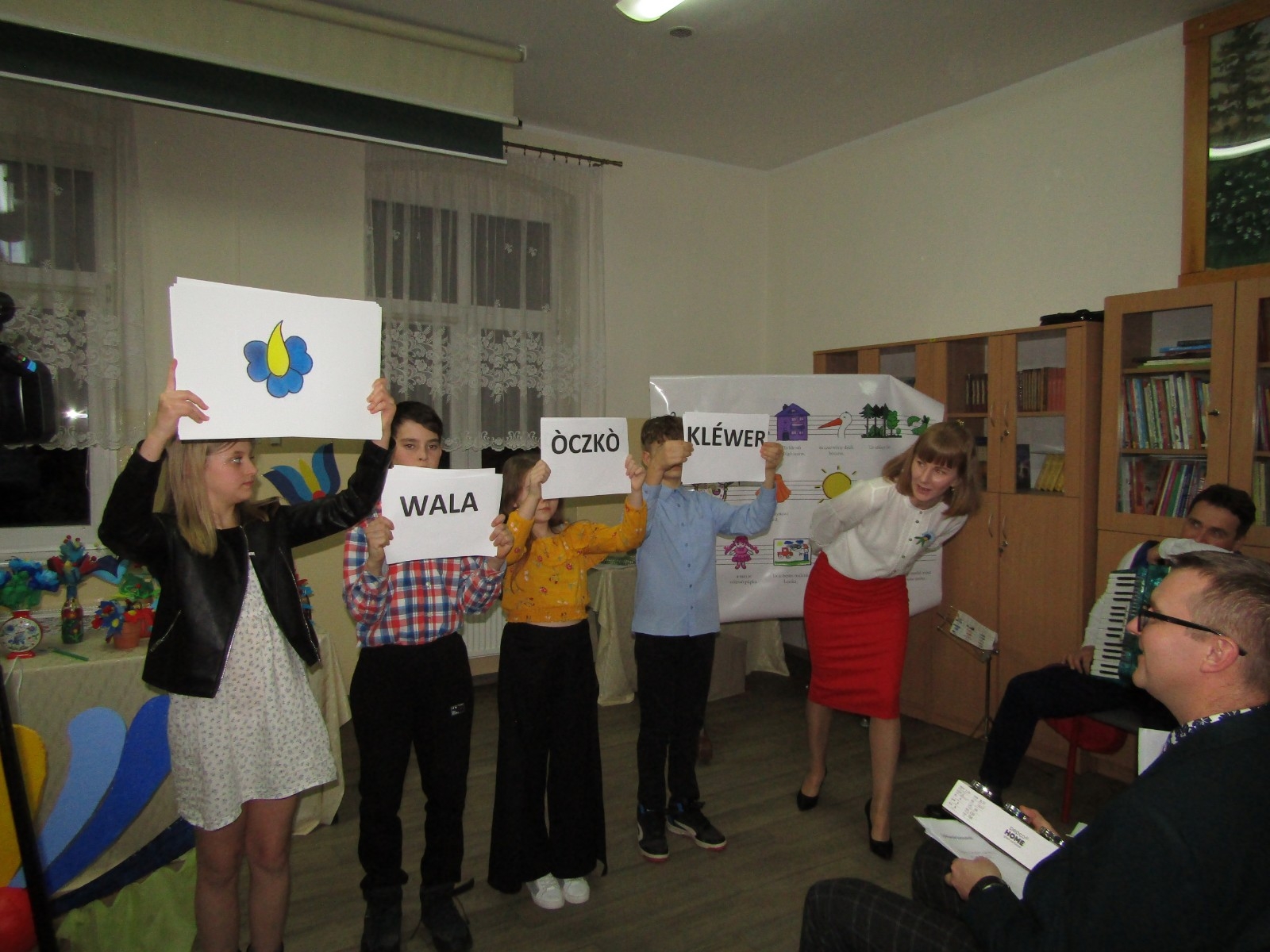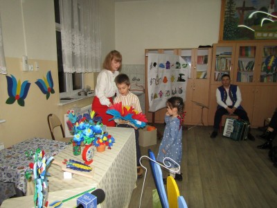 Ponadto odbyły się różne konkursy. Jeden polegał na wskazaniu kaszubskiej nazwy kwiatów ze wzorów kaszubskich. Kolejny na rozpoznaniu po smaku lub dotyku warzyw i owoców oraz podaniu ich kaszubskiej nazwy. Najważniejszą częścią wieczoru była prezentacja, wykonanych przez uczniów i ich rodziny, pięknych i bardzo pomysłowych kwiatów kaszubskich. Można było także poznać swoją przyszłość, która była ukryta w „babeczce z wróżbą”. Nie zabrakło oczywiście wspólnych śpiewów w kaszubskim języku oraz nauki nut o kolorach.