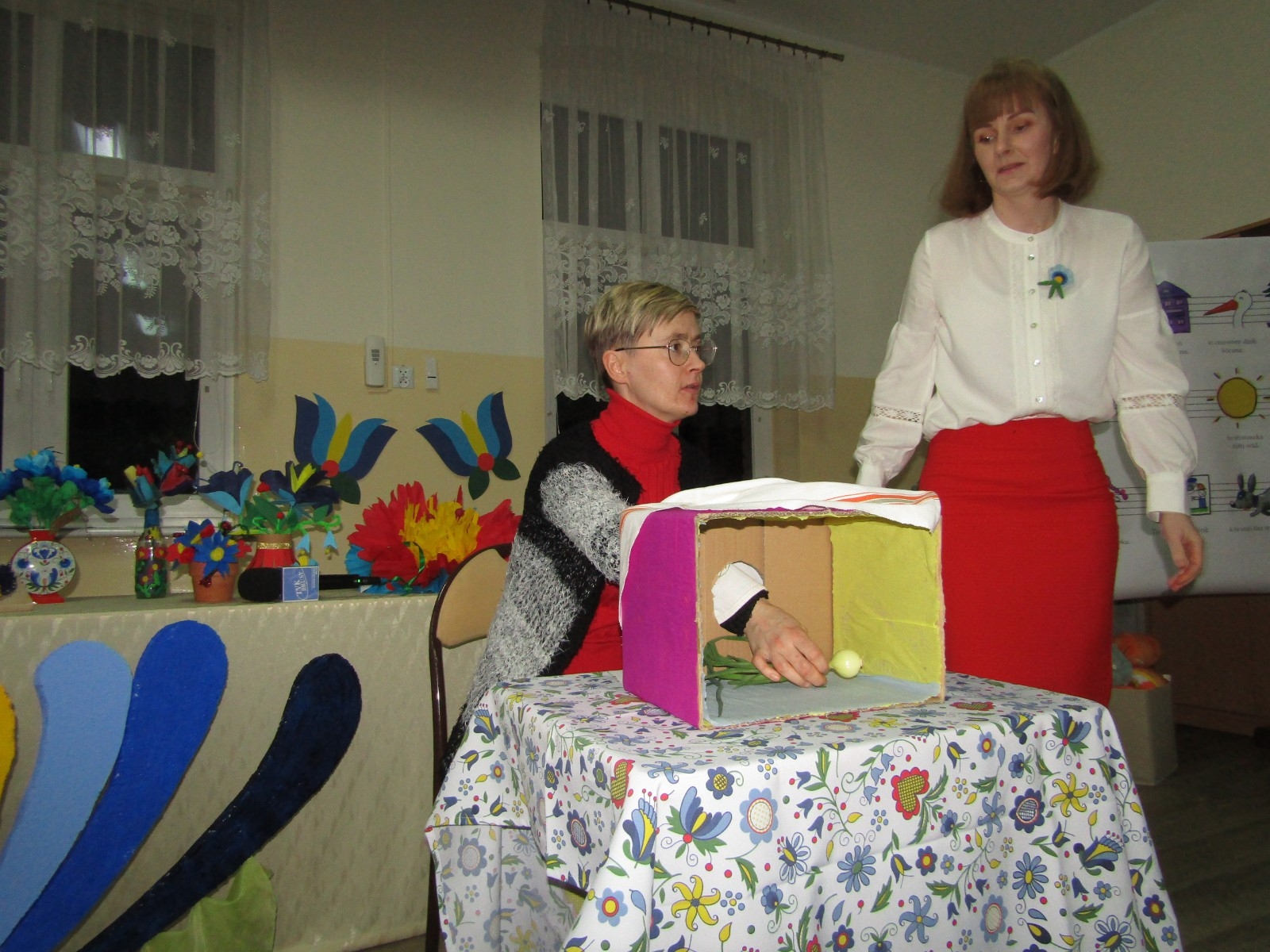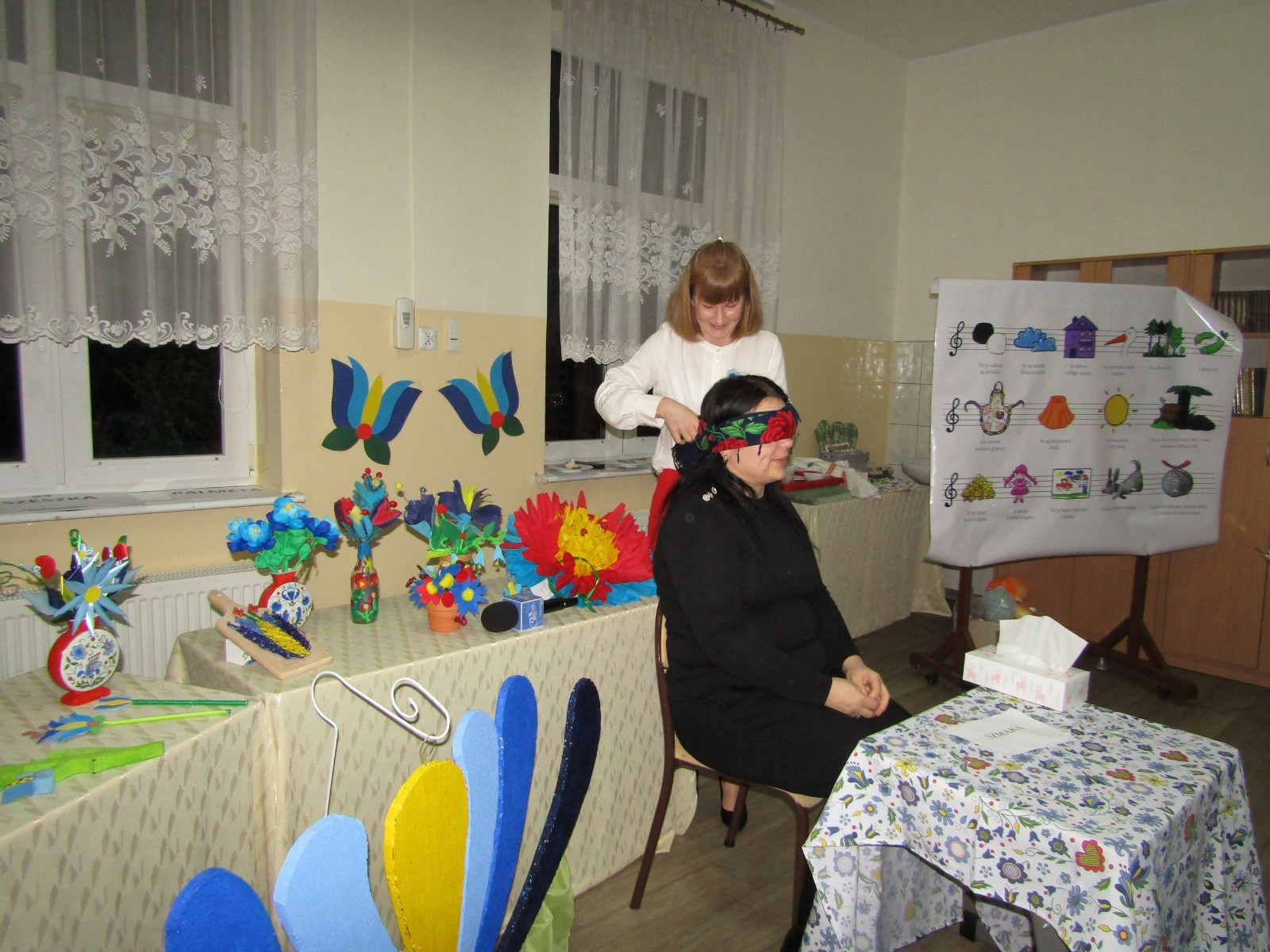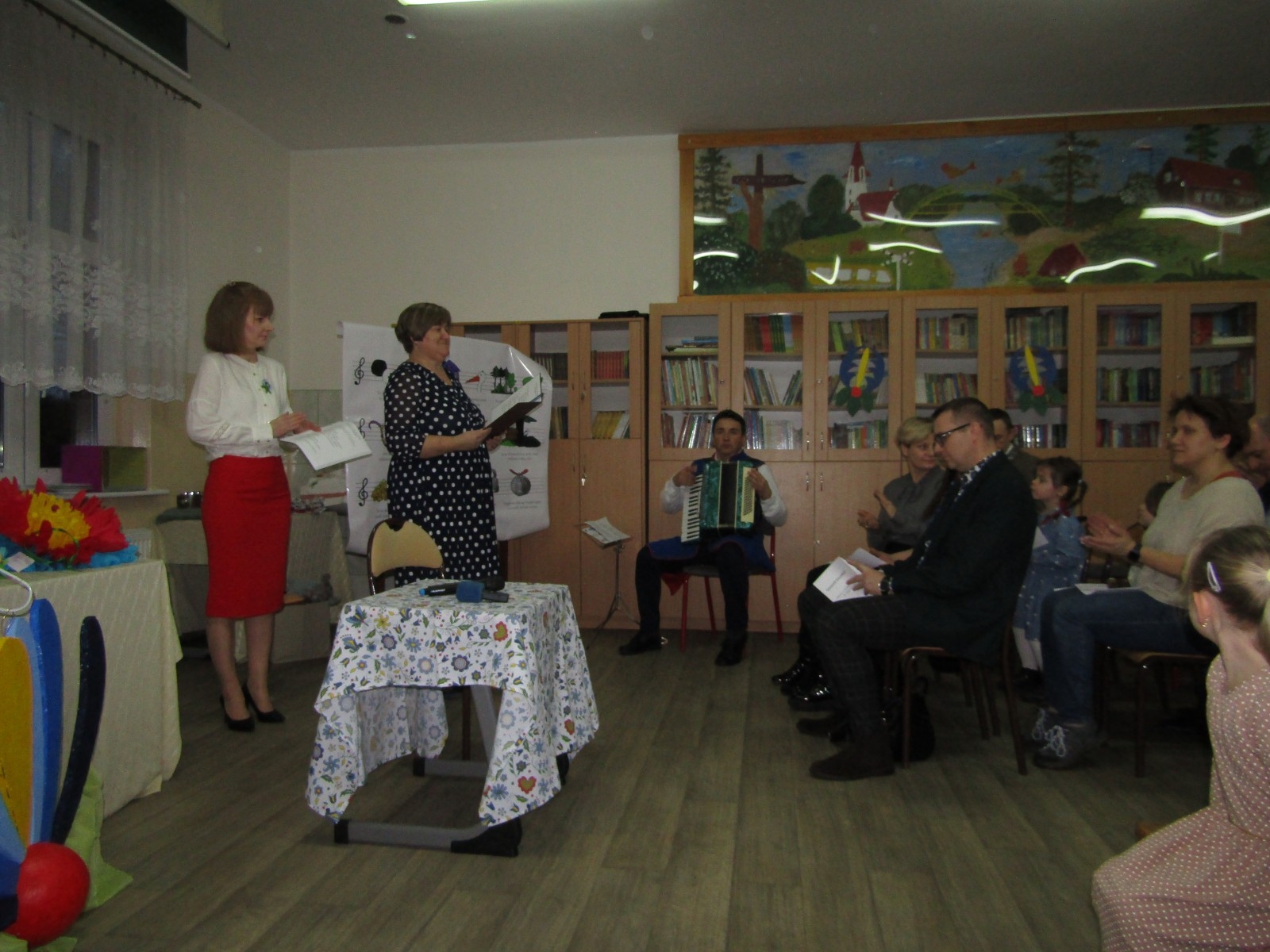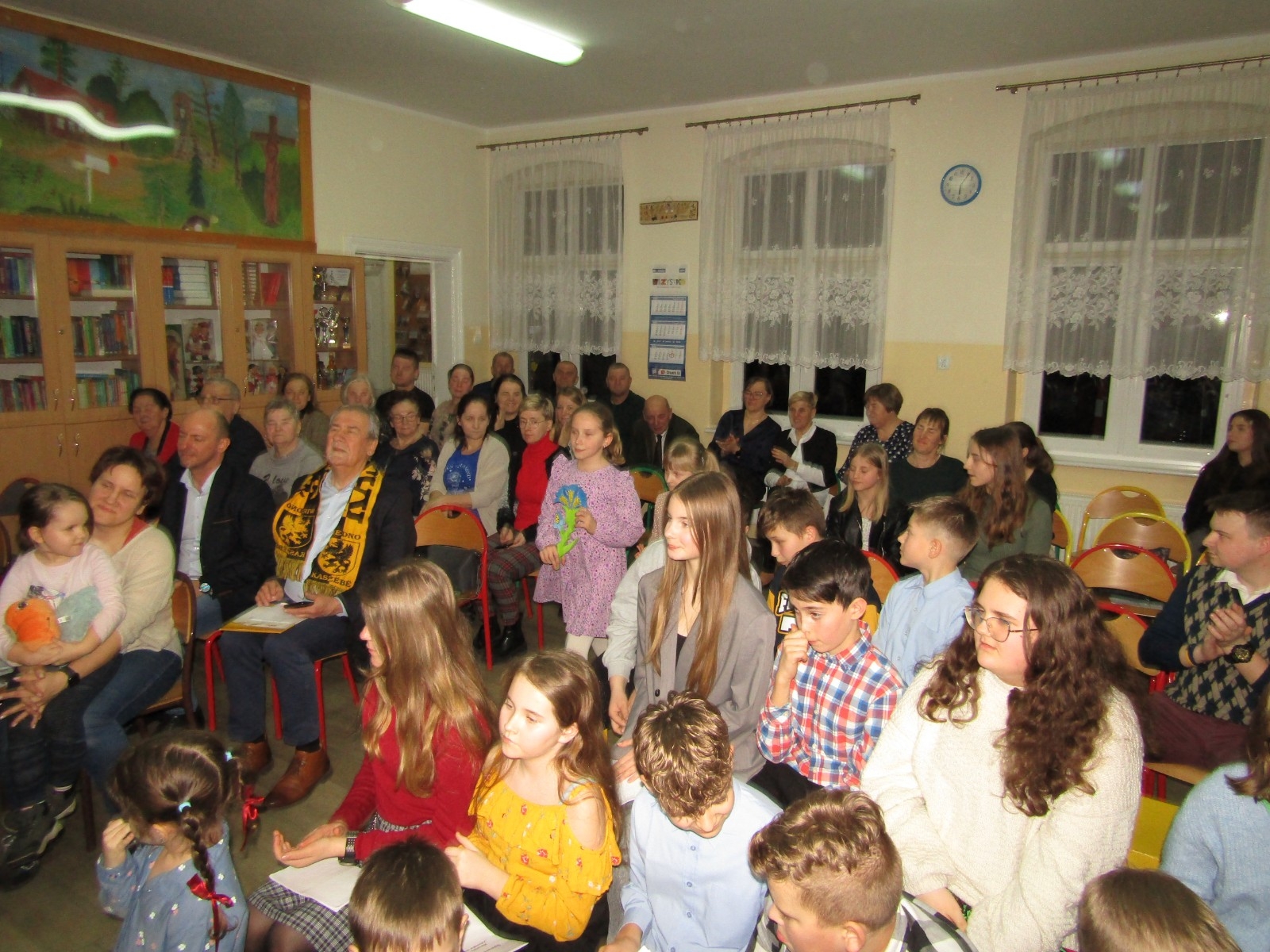 Ponadto odbyły się różne konkursy. Jeden polegał na wskazaniu kaszubskiej nazwy kwiatów ze wzorów kaszubskich. Kolejny na rozpoznaniu po smaku lub dotyku warzyw i owoców oraz podaniu ich kaszubskiej nazwy. Najważniejszą częścią wieczoru była prezentacja, wykonanych przez uczniów i ich rodziny, pięknych i bardzo pomysłowych kwiatów kaszubskich. Można było także poznać swoją przyszłość, która była ukryta w „babeczce z wróżbą”. Nie zabrakło oczywiście wspólnych śpiewów w kaszubskim języku oraz nauki nut o kolorach.