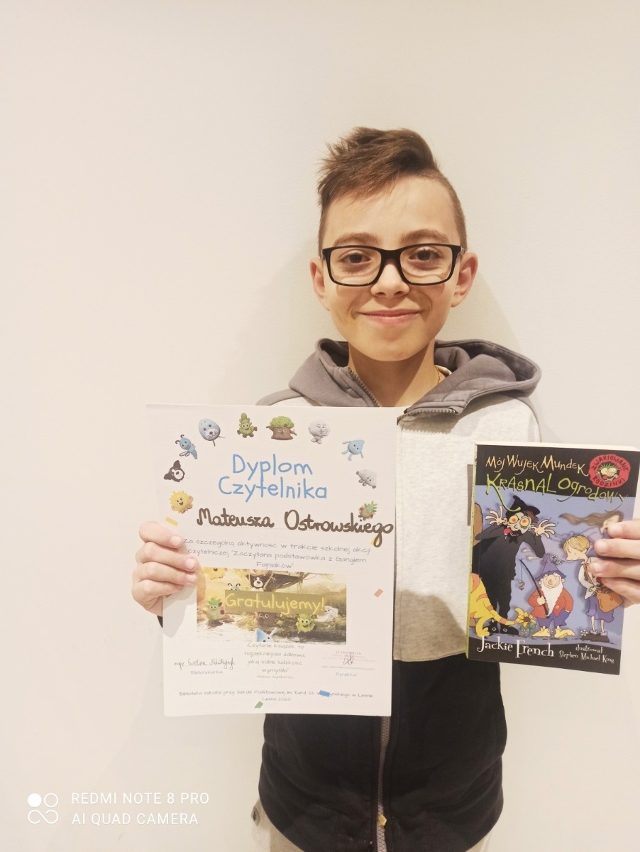 Październik i listopad 2020 roku w klasach I-III Szkoły Podstawowej w Leśnie minął czytelniczo. Najmłodsi uczniowie leśnieńskiej placówki wzięli udział w akcji "Zaczytana podstawówka z Gangiem Fajniaków" zorganizowanej przez szkolną bibliotekę, która polegała na czytaniu ulubionych książek, opisywaniu ich i zbieraniu specjalnych naklejek. Najwytrwalszymi czytelnikami okazali się: